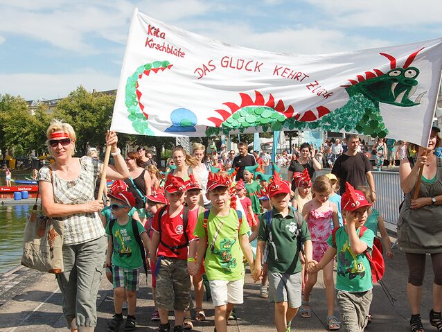 Die 18 Kitas der Kita gGmbH haben Vielfalt im Ferienprogramm. Bei schönem Wetter dreht sich natürlich alles ums Draußensein – neben Wasserspielen und Modderpartys in beinahe allen Einrichtungen gibt es bei den „Sonnenschein“ Kindern zum Beispiel Wanderungen an den Faulen See, Sandburgenwettbewerbe bei den Waldgeistern und unter dem Motto „Die Future Kids im wilden Westen“ warten Streifzüge und Entdeckungstouren durch die Kita-Umgebung. Zudem bereiten sich die Kinder schon für die Teilnahme am „Mother Earth“-Festival vom 5. bis 10. August vor und bemalen zum Beispiel Weltkugeln aus Styropor, Schilder und Kostüme, die sie dann beim großen Eröffnungsumzug tragen werden.